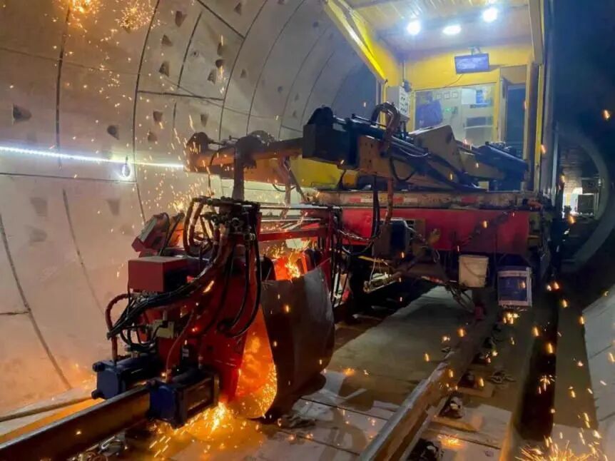深入地下30多米的地铁隧道,一架比三轮代步车略大的设备架设在铺设好的钢轨上,发出低声的鸣响,声响与怠速中的轿车相当。伸出的机械臂里,是取代柴油机的新能源焊轨机。随着滚烫的铁屑在隧道里划出一道道绚丽的弧线,两根25米长的标准轨精准对接。焊接一节焊头,大概需要五分钟左右。
