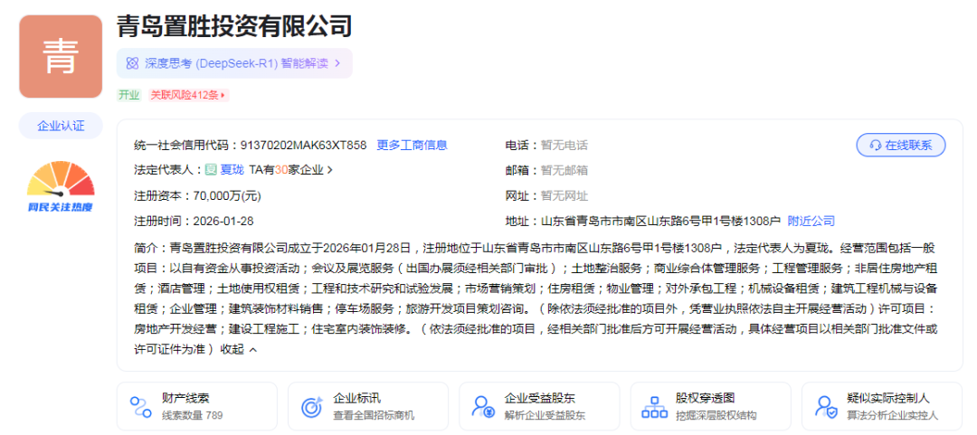 1月28日,青岛置胜投资有限公司在市南区注册成立,注册资本高达7亿元,背后两大股东分别为华润置地(山东)发展有限公司(下称“山东华润置地”)与青岛青铁智能科技有限公司(下称“青铁智能”)。