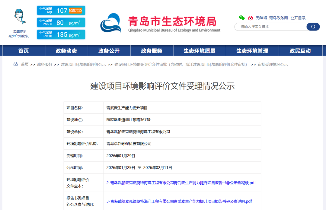 1月29日,青岛市生态环境局发布“青武麦生产能力提升项目环境影响评价文件受理情况”显示,青武麦拟投资41648.2万元在现有厂区内、依托现有车间建设“青武麦生产能力提升项目”。