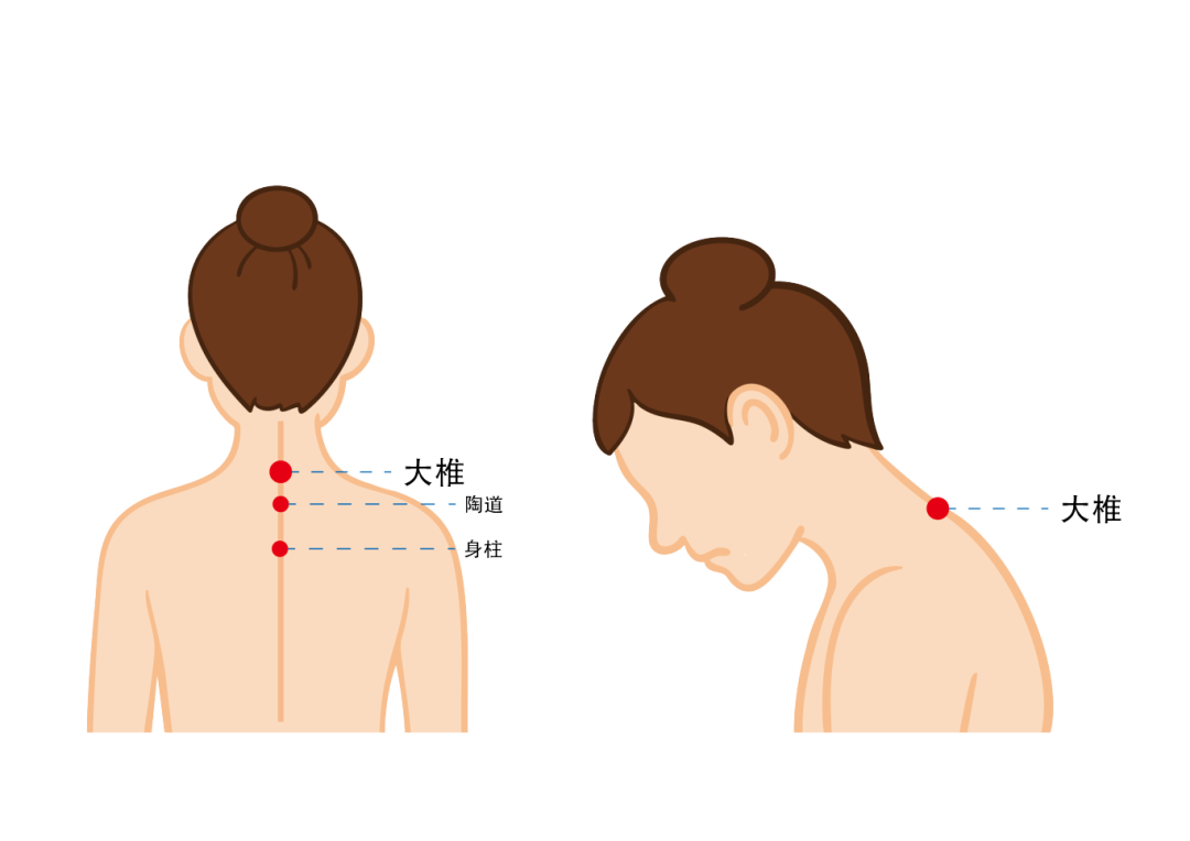 取穴定位:低头时,颈后部最突出的骨头(第七颈椎)下方凹陷中。