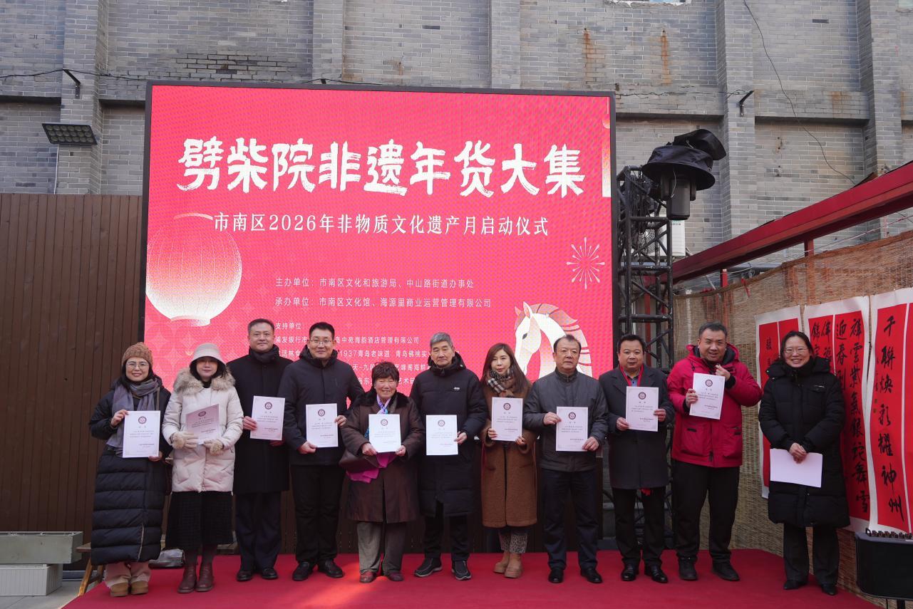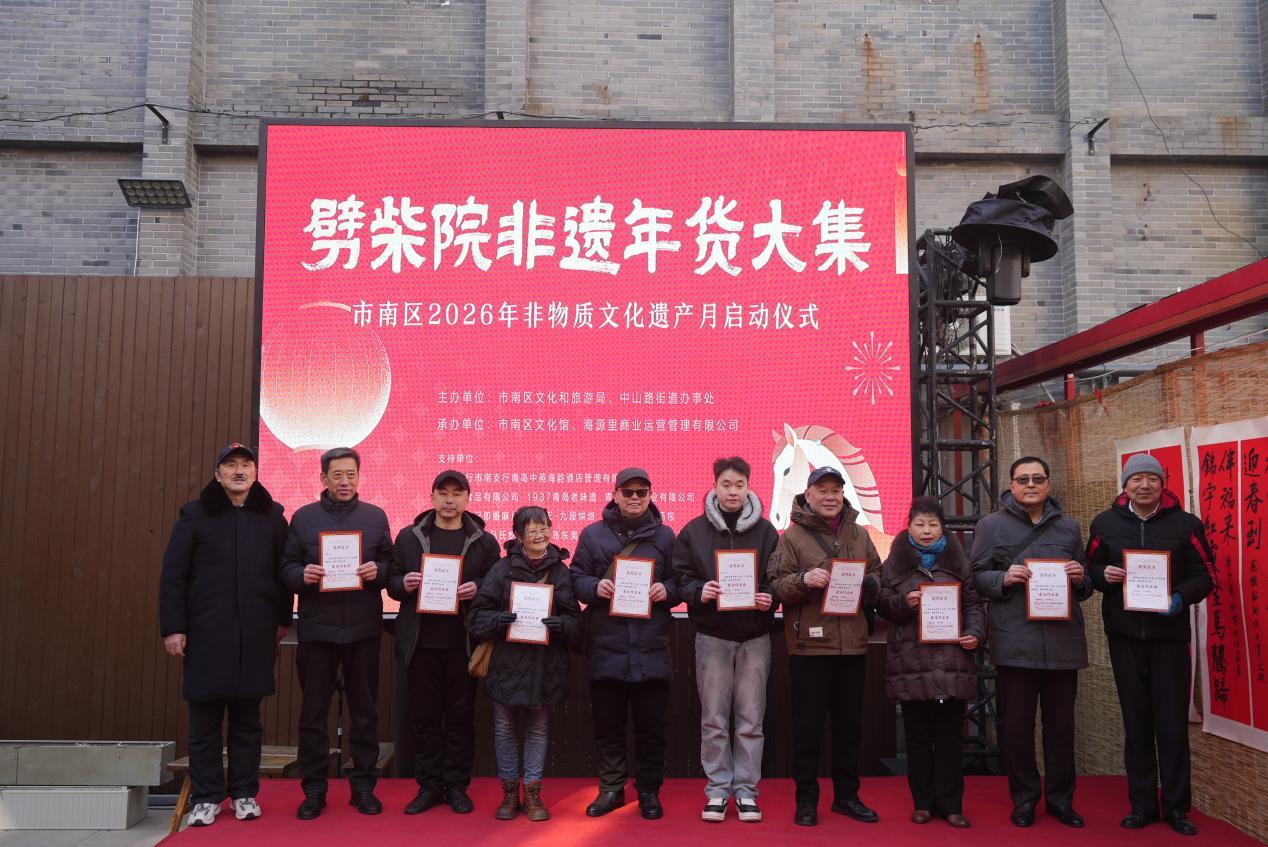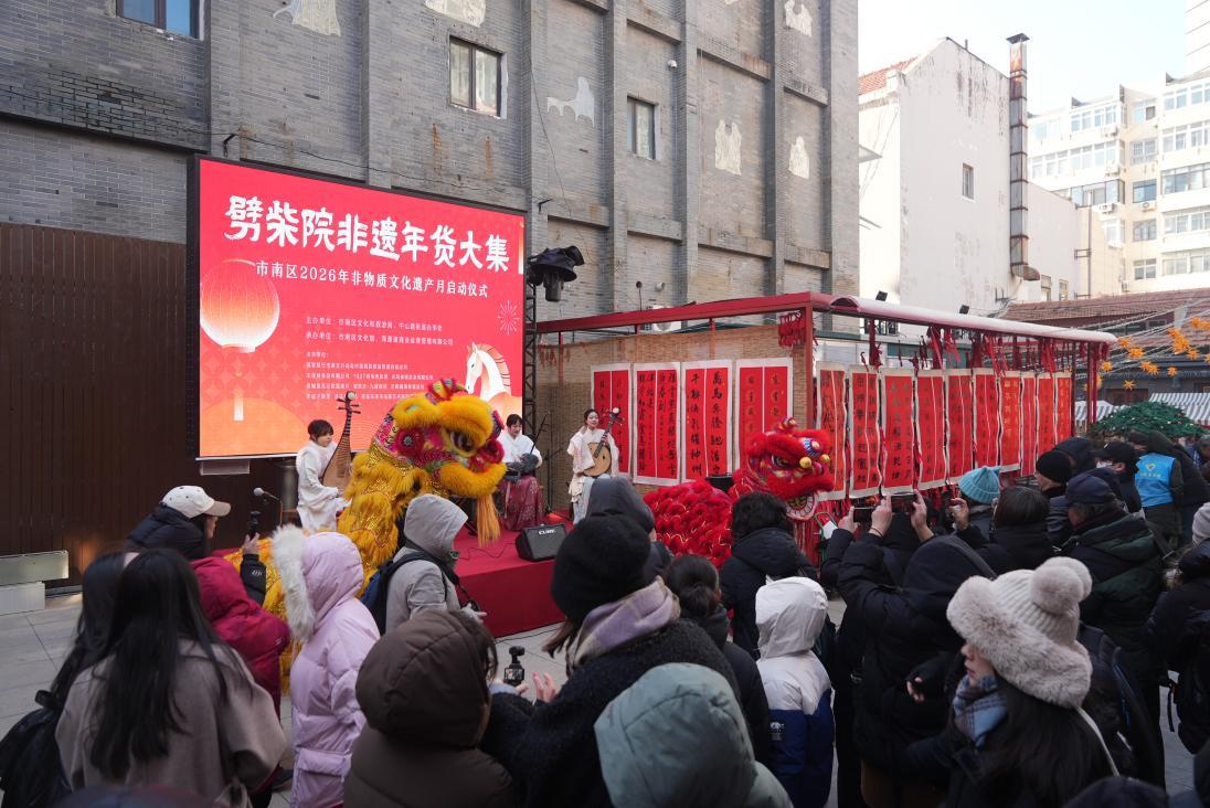 骏马驰骋送祥瑞,万象更新贺新春。锣鼓声中醒狮跃动,劈柴院小广场被浓浓的“非遗年味”悄然唤醒,处处洋溢着一派红火喜庆的中国年景象。2月7日上午,劈柴院非遗年货大集暨2026年市南区“非遗月”启动仪式在劈柴院小广场火热举行,本次活动以“非遗贺新春 寻味中国年”为主题,由市南区文化和旅游局、中山路街道办事处主办,市南区文化馆、海源里商业运营管理有限公司承办,浦发银行市南支行以及十余家非遗企业支持,吸引了众多市民群众参与,现场人头攒动,年味十足。