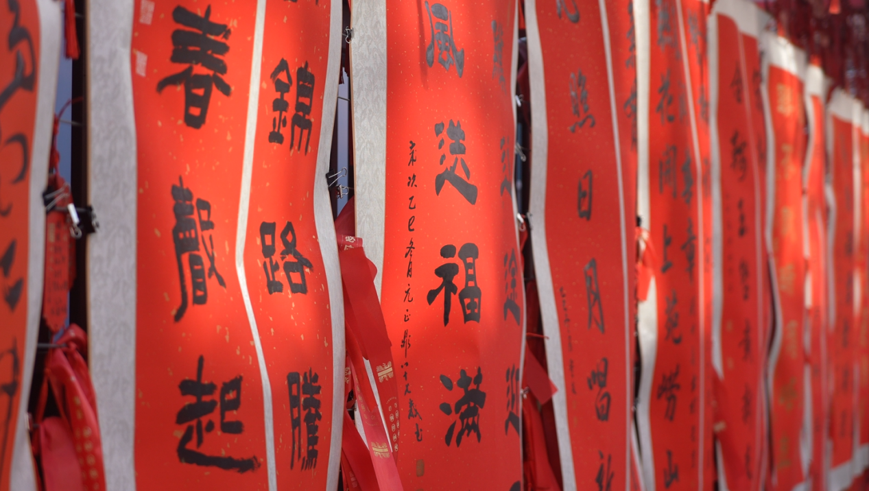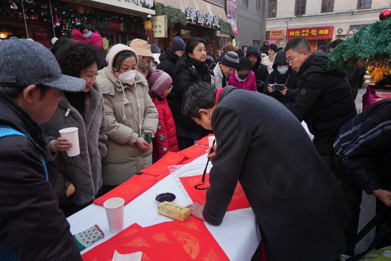一旁,青岛市第十七届“万马奔腾送福联”楹联大赛的40余幅获奖作品同步展出,一副副对联写满吉言,红纸黑字间流淌着美好的祝愿,笔墨之间传递着新春的祝福,为老街增添了最地道的年味。
