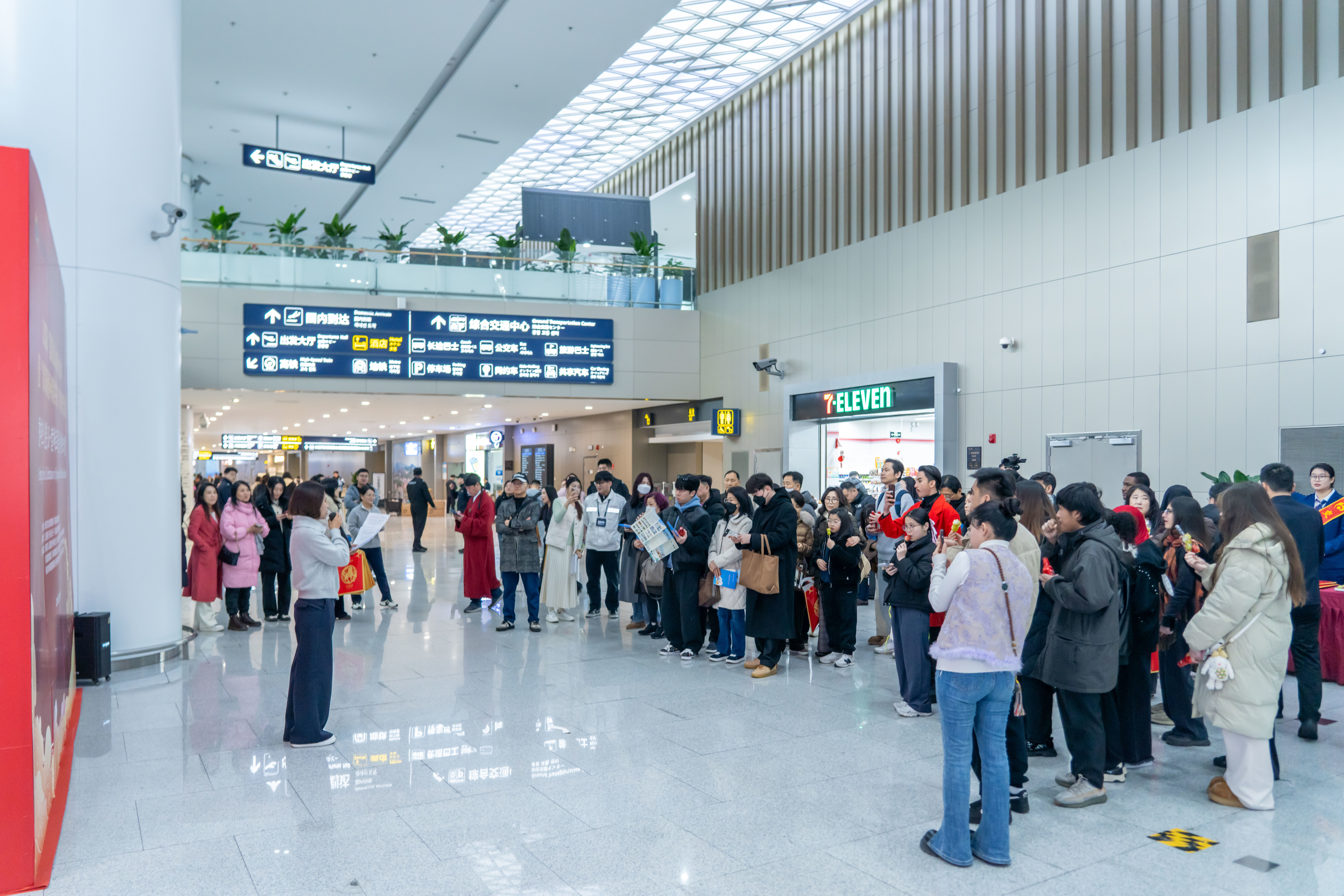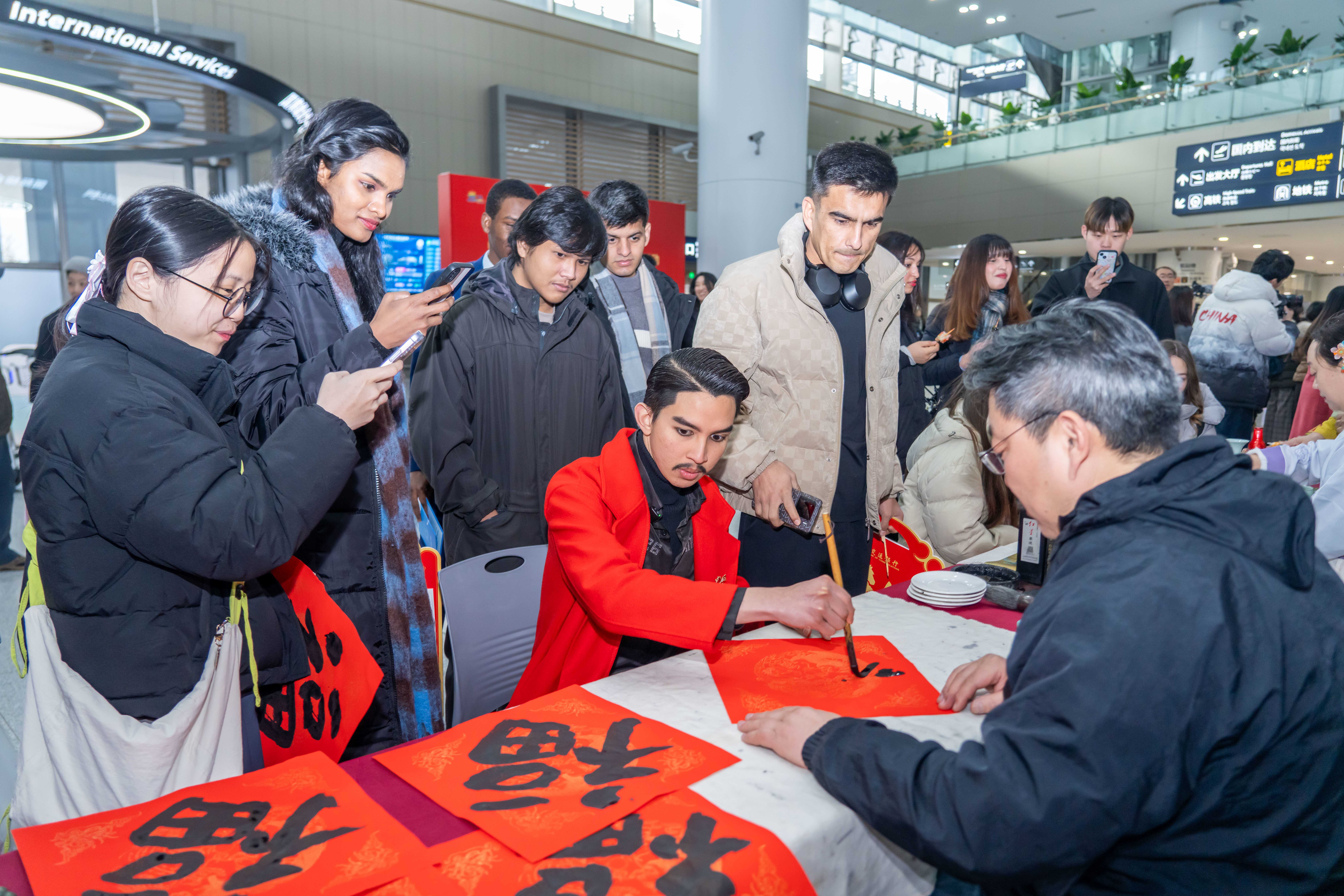 写福字、剪窗花、品茶、制香、尝糖葫芦,再带走一份满载心意的青岛文旅新春伴手礼……2月10日适逢北方小年,由青岛市文化和旅游局与青岛国际机场集团共同主办的2026“国际友人@Qingdao”暨“青岛新春·韩韵共融”欢乐春节活动,在青岛胶东国际机场境外来宾综合服务中心温暖启幕。活动当日吸引近300人参与,其中包括约130名韩国入境游客及来自8个国家的在青国际友人。现场气氛热烈,欢声笑语中,“我非常喜欢青岛啤酒和美食,这次一定要好好品尝”“一下飞机就能体验春节非遗,太惊喜了!”等赞叹不绝于耳。