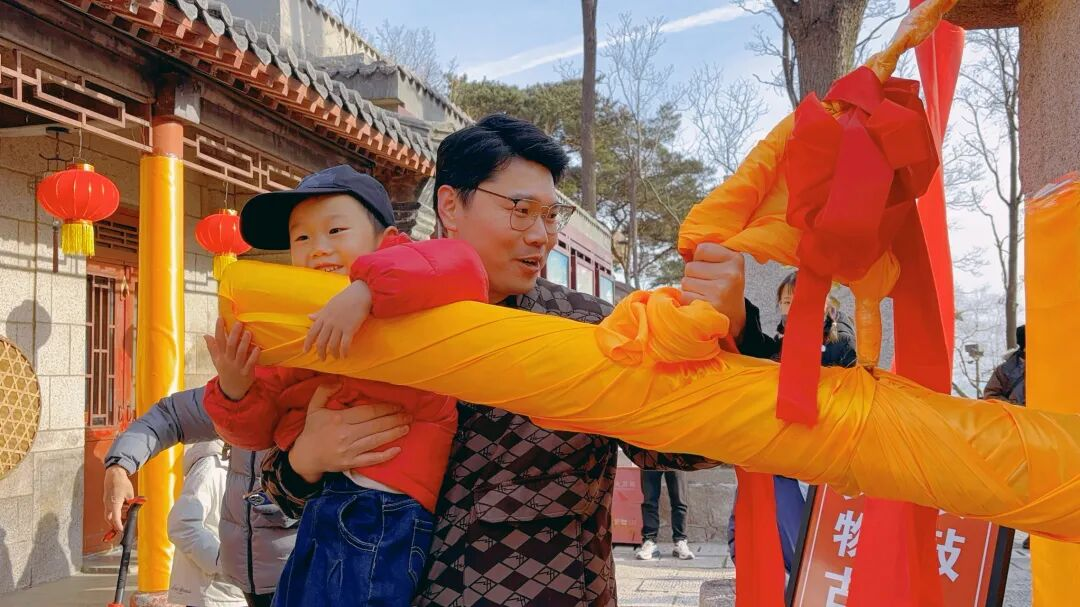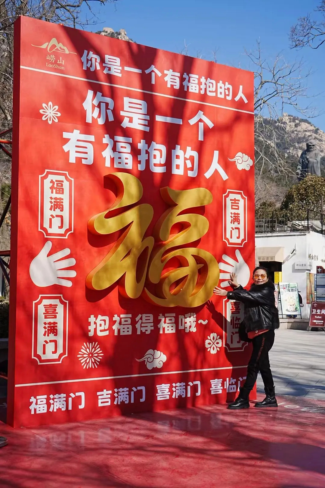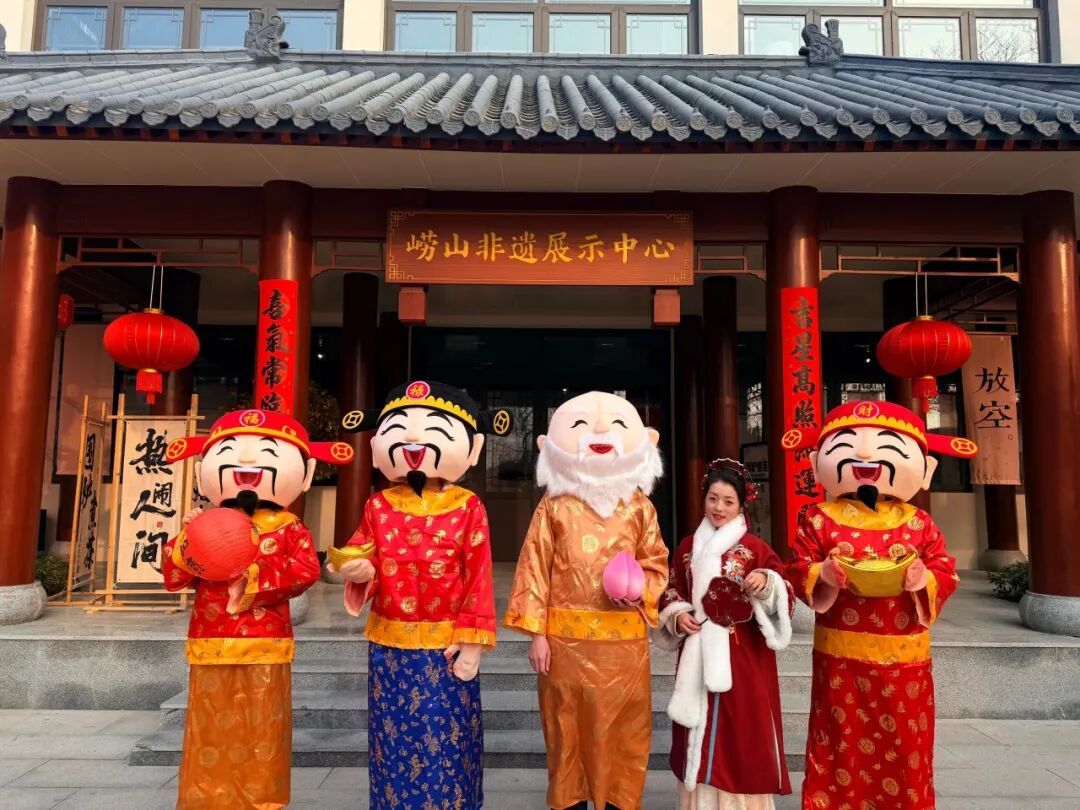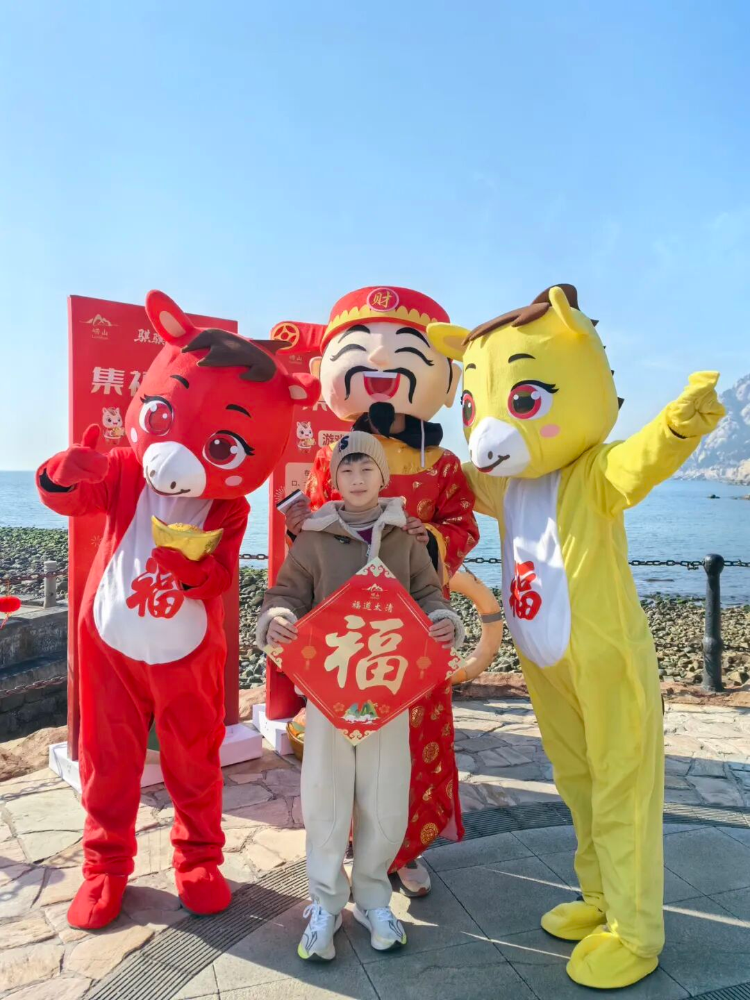 在春节期间,工作人员穿戴具有崂山文化特色的“福、禄、寿、喜、财”五福主题玩偶服,引导游客完成集章打卡任务,参与游戏抽奖。