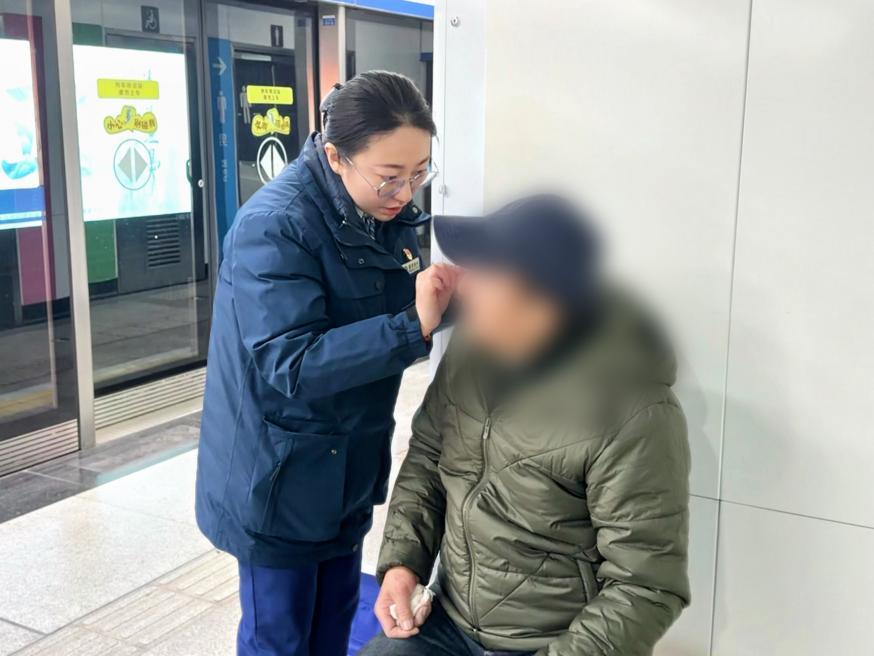 (地铁青岛北站工作人员为脸部磕碰的老年乘客清理伤口)