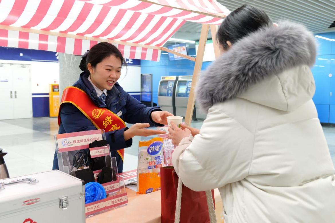 (五四广场站设“绿波暖心服务台”,工作人员为乘客递上热水)