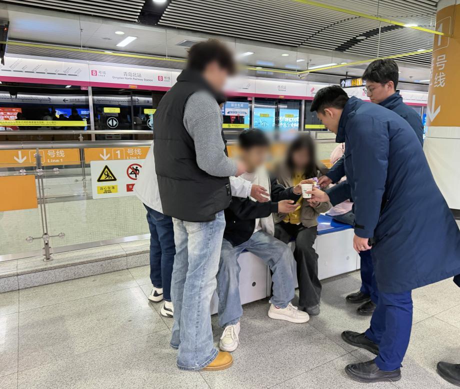 (地铁青岛北站工作人员为低血糖晕倒的乘客递热水糖块)