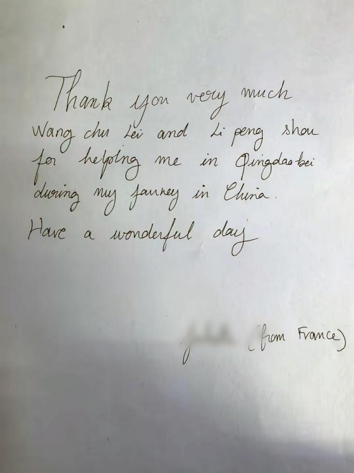 (法国女游客手写感谢信,点赞地铁青岛北站工作人员提供引路并协助购票的贴心服务)
