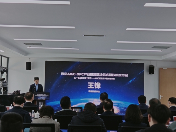 王锋在致辞中表示,青岛AIGC·OPC产业基地落地,是市南区贯彻市委市政府战略部署、推动人工智能与数字视频产业深度融合的重要实践。市南区将充分发挥自身资源禀赋优势,持续完善政策支持体系,强化配套服务保障,加快集聚优质产业资源,构建更加完备的产业生态,打造国内一流的AIGC·OPC创业高地。