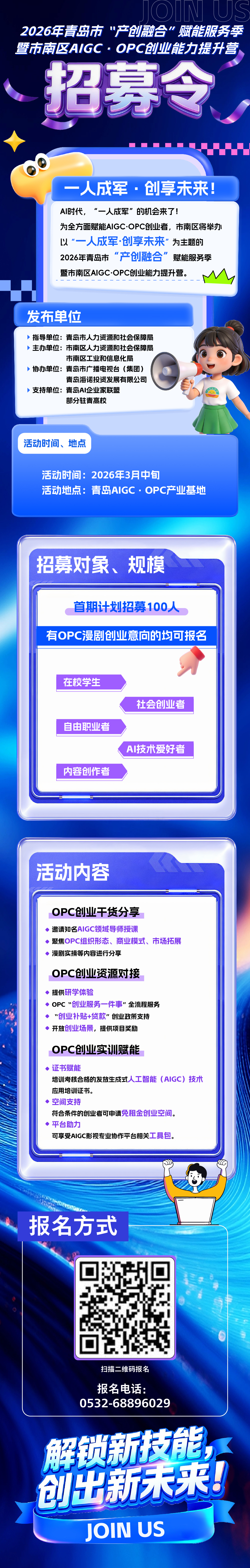 AI时代,“一人成军”的机会来了!为全方面赋能AIGC·OPC创业者,市南区将举办以“一人成军·创享未来”为主题的2026年青岛市“产创融合”赋能服务季暨市南区AIGC·OPC创业能力提升营。