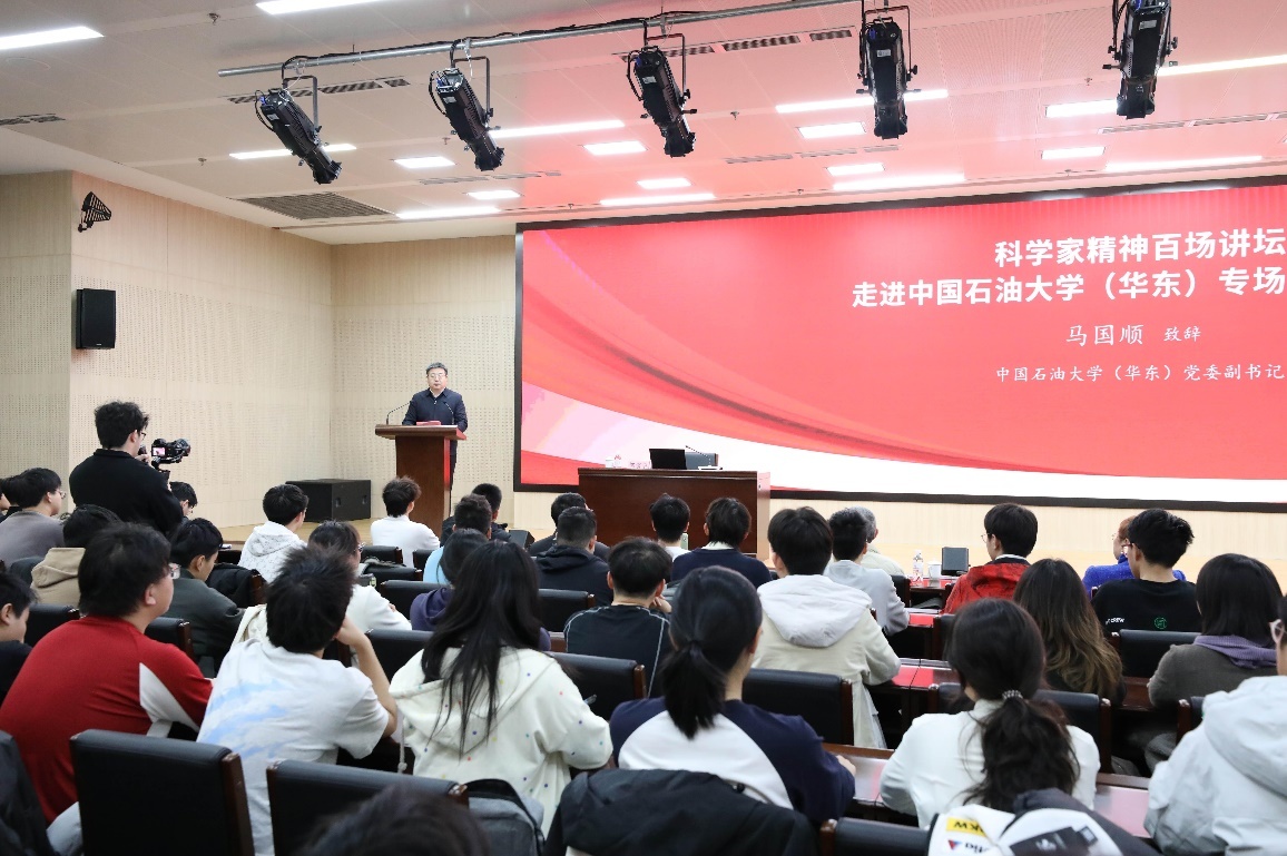 马国顺代表学校致辞,对邹宗平的到来表示热烈欢迎和诚挚感谢。他指出,李四光先生是我国现代地质学的奠基人,他开创性运用地质力学理论指导新中国石油勘探,为甩掉“贫油国”的帽子作出了不可磨灭的贡献。作为新中国第一所石油高等学府,传承和弘扬以李四光先生为代表的科学家精神是学校义不容辞的责任。他寄语青年学子,要以李四光先生为榜样,传承爱国情怀,锤炼过硬本领,扛起时代使命,为“能源的饭碗端在自己手里”贡献青春力量。