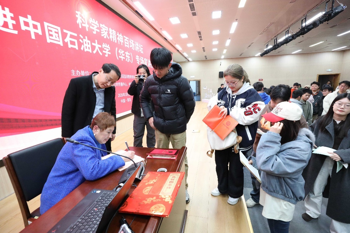 报告结束后,大学生代表向邹宗平献上鲜花,表达青年学子对老一辈科学家的崇高敬意,同学们竞相请邹宗平签名寄语、拍照留念。