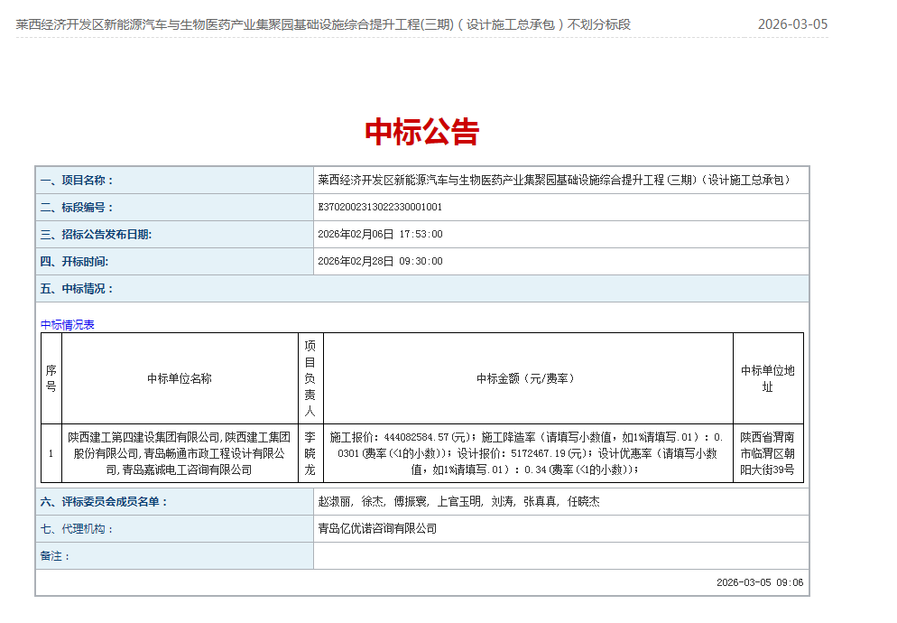 3月5日,青岛市公共资源交易电子服务系统发布莱西经济开发区新能源汽车与生物医药产业集聚园基础设施综合提升工程(三期)中标公告。