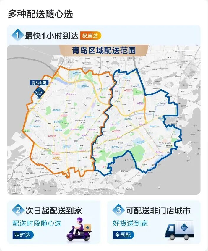 千呼万唤,3月16日,青岛山姆极速达服务已上线,覆盖市北、崂山部分区域,范围内的小伙伴们今天就可以在家手机下单,动动手指山姆好物最快1小时*送到家~更多极速达覆盖区域即将上线,还未覆盖的小伙伴可以使用全国配服务,品质好商品也能送货上门!