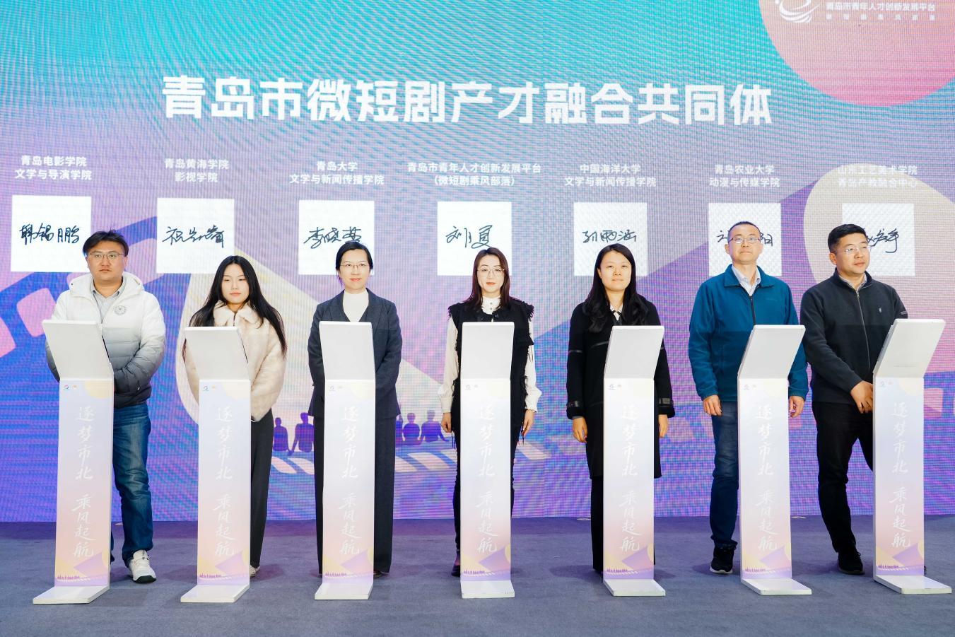 活动中,“青岛市微短剧产才融合共同体”正式成立,中国海洋大学、青岛大学、山东工艺美术学院等6所省内高校相关院系代表与青岛市青年人才创新发展平台(微短剧乘风部落)代表共同登台,按下合作启动键。