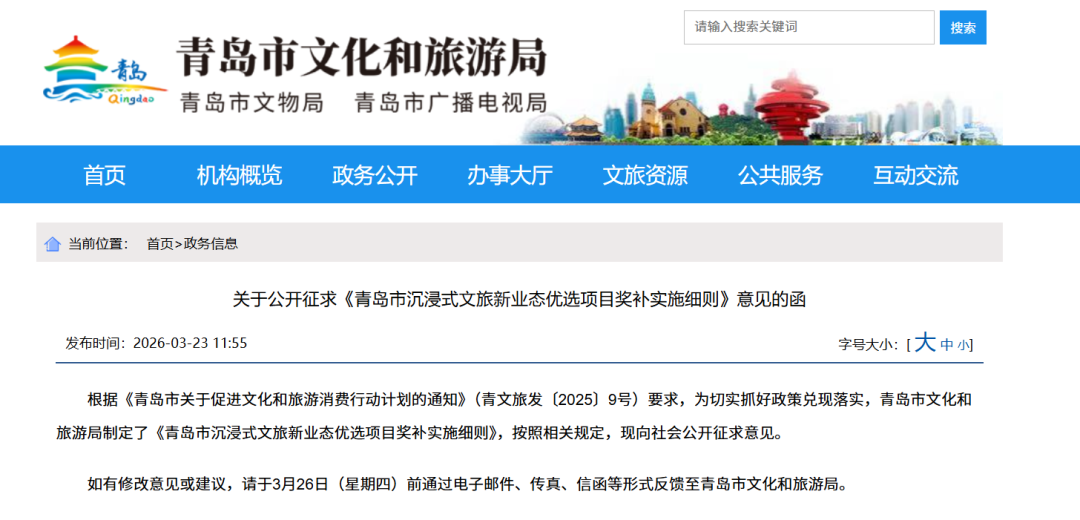 3月22日,青岛市文化和旅游局发布《青岛市沉浸式文旅新业态优选项目奖补实施细则》,面向社会公开征求意见。