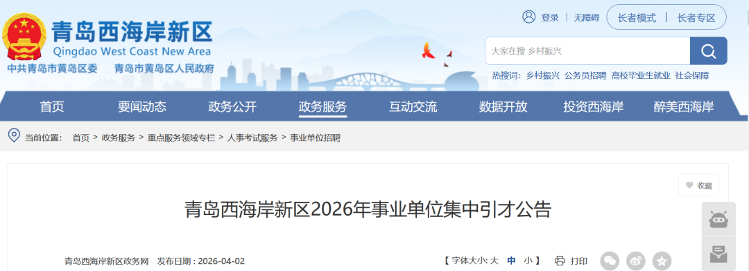 4月2日,青岛西海岸新区发布2026年事业单位集中引才公告,为加快建设新时代社会主义现代化示范引领区,加强青年干部人才储备,青岛西海岸新区组织开展2026年事业单位集中引才活动,决定选聘区优秀党政干部储备人才27名、区专业化干部人才20名、区教育和体育局所属学校储备人才30名。