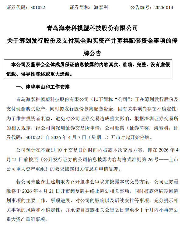 根据公告,海泰科已与旭域股份实际控制人杨宝和等主要股东签署了《股权合作备忘录》。公司股票自4月7日起停牌,预计最晚于4月21日前披露交易方案。