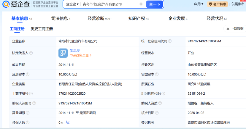 日前,青岛市比亚迪汽车有限公司(以下简称“青岛比亚迪”)发生工商变更,田春龙卸任公司董事长、法定代表人,由罗忠良接任。