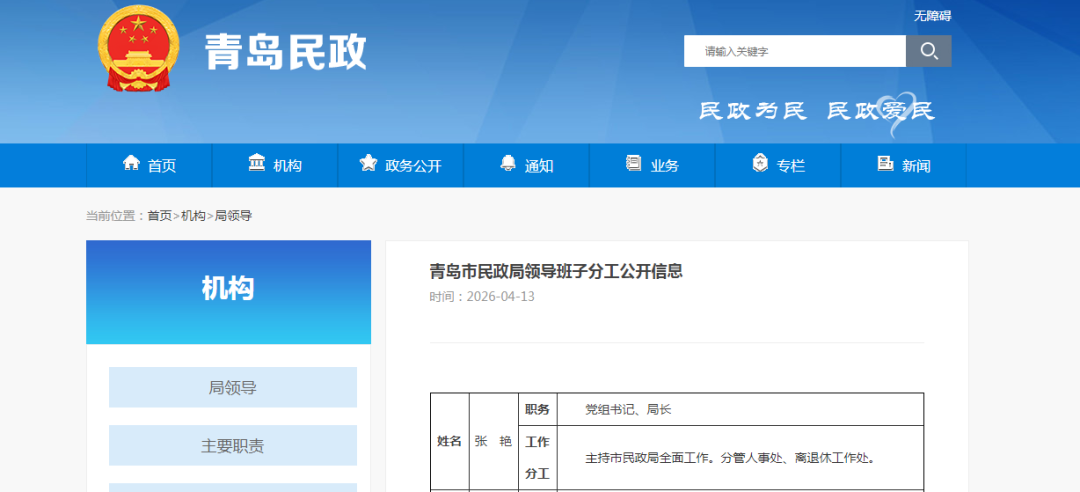 值得关注的是,青岛市民政局官网已于4月13日更新“局领导”信息,张艳职务为青岛市民政局党组书记、局长,主要分工为主持市民政局全面工作。分管人事处、离退休工作处。