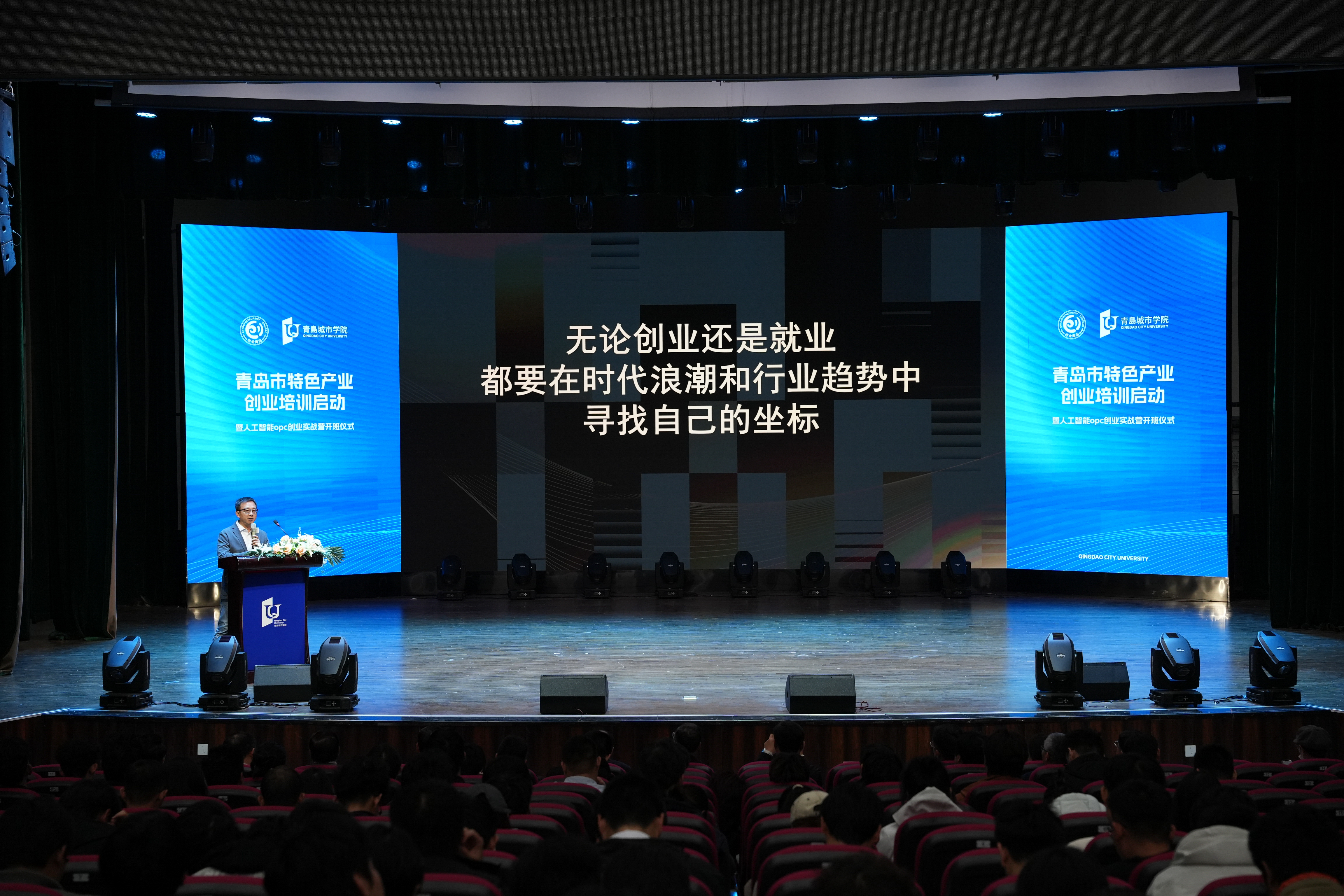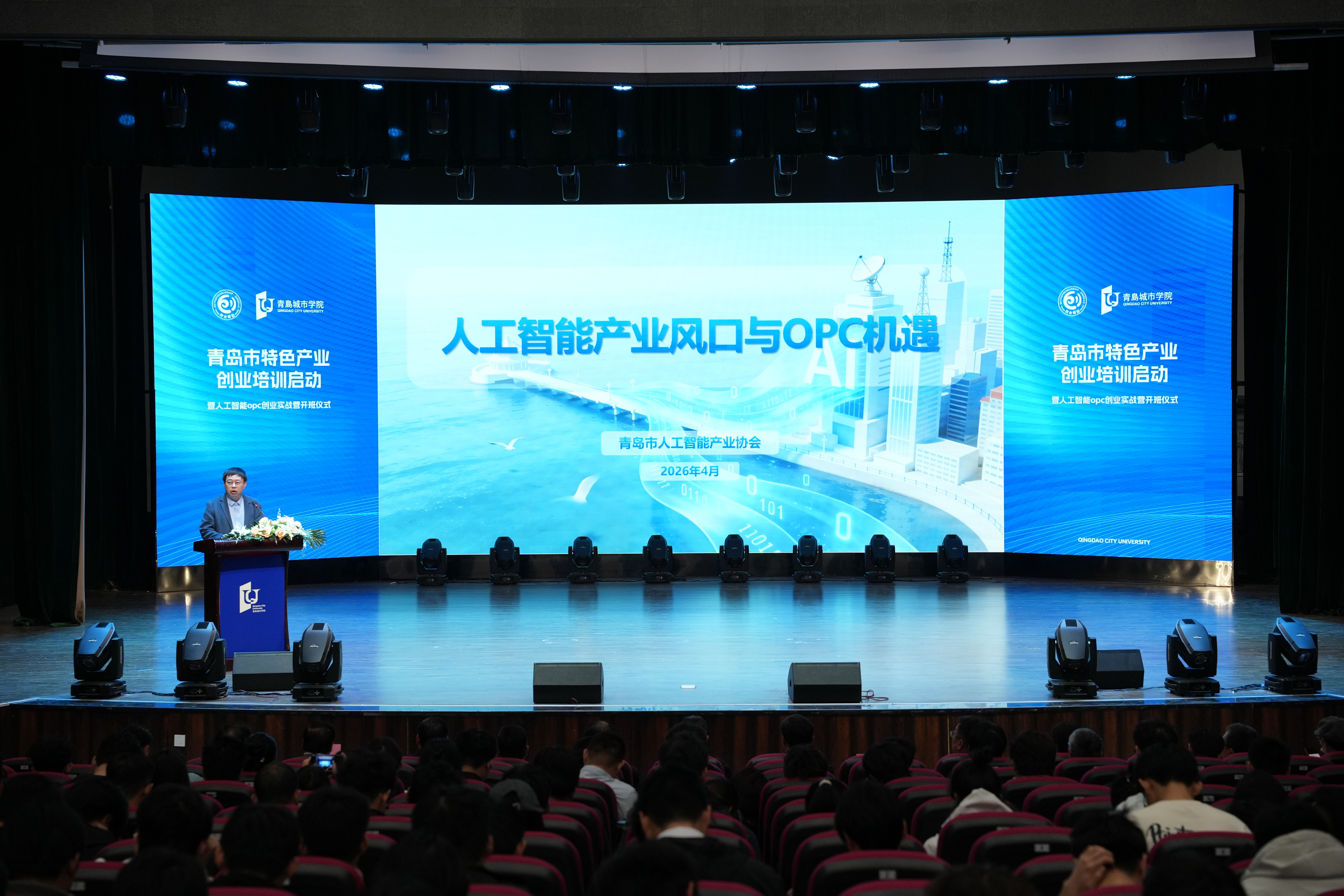 为精准对接青岛重点产业发展需求,加快培育新质生产力、壮大OPC规模,4月17日上午,由山东省人力资源和社会保障厅指导,青岛市人力资源社会保障局、市工信局、青岛城市学院联合主办的青岛市特色产业创业培训启动暨人工智能OPC创业实战营开班仪式,在青岛城市学院顺利举行。400余名高校师生、行业协会代表、创业导师现场参会,围绕人工智能产业创业机遇、青年人才培养路径、产教融合落地模式等核心话题,开展面对面交流研讨,现场氛围热烈。